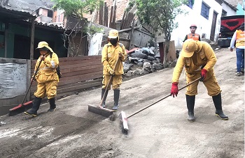 Desde muy tempranas horas de la mañana, nuestro personal de limpieza pública viene trabajando en la remoción, retiro y limpieza del lodo producto del deslizamiento por las fuertes lluvias en la quebrada ubicada en el AH Clorinda Málaga – zonal 1 Comas.